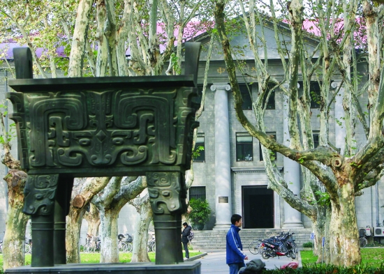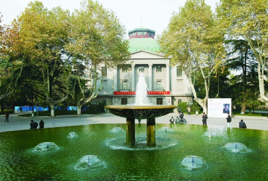 跨过大门,目光首先无法逾越的是三层高的大礼堂。对东大而言,这个由中央大学首任校长张乃燕筹款兴建于1930年的礼堂,已成为一个不可替代的象征。正立面的四根立柱和顶部铜质大穹窿颇为惹眼,盛放的喷泉衬着檐角的古典图案,让它看起来更像是一座富有艺术感的歌剧院。