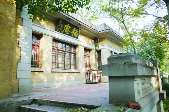 往西走,一棵古劲苍遒的松柏下,两个戴着四方帽的女孩在合影留念。这棵名为“六朝松”的古树,相传是六朝时的遗物,掐指一算,竟有上千的年岁了。古树之后,有座叫做“梅庵”的小房子。这是为纪念近代著名的教育家李瑞清所建。1916年建成时,还是茅屋3间,1933年改建为了砖混结构。房子虽小,但故事很多。梅庵曾是会议、讲习场所,梁启超、胡适之曾在这里开讲论学,恽代英、瞿秋白等也都曾在这里参加过各种会议。