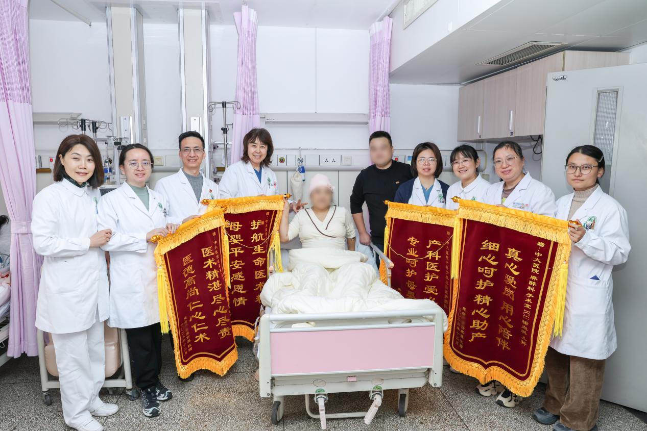 “于主任、吴主任,谢谢你们救了我和宝宝的命,让我们一家还能团圆!”12月25日上午,在东南大学附属中大医院产科病房,即将出院的产妇小云(化名)和家人将四面鲜红的锦旗,郑重地送到妇产科于红主任医师、泌尿外科吴剑平主任医师等医护人员手中。就在9天前的深夜,孕31周的她因“凶险性前置胎盘”引发致命性大出血,命悬一线。一场由妇产科、泌尿外科、麻醉手术与疼痛管理科、医学检验科、输血科、儿科、重症医学科等多学科团队紧密协作的“极限救援”随即展开,最终成功守护了母子三人的平安……