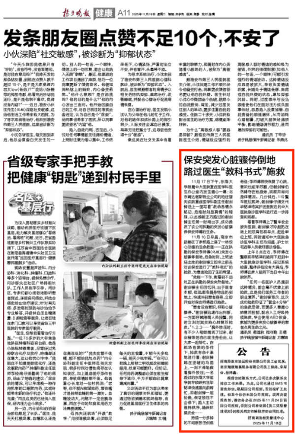 “任何一名医护人员遇到这种情况,都会毫不犹豫上前抢救,这是我们医务工作者的职业素养。”谢剑锋表示,这次成功抢救印证了“黄金4分钟”的急救定律,若更多人掌握心肺复苏技能,配合人工呼吸持续施救,学会使用AED设备,就能为更多突发心脏骤停的患者点亮生命之光。
