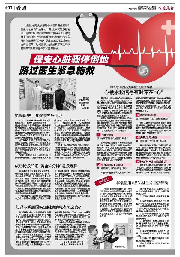 当天早晨7点47分左右,谢剑锋打车到达丁家桥路,“我刚一下车,就看到不远处正在执勤的保安突然倒地。”谢剑锋回忆说,出于医者本能,他迅速将随身物品扔到地上,快速冲到患者身旁,立即开始对保安师傅进行施救。