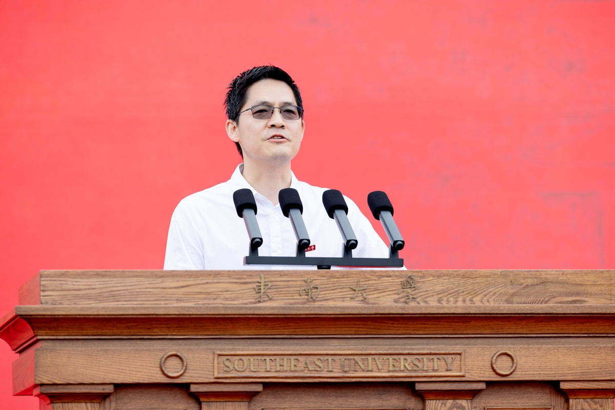 东南大学1994级校友、上海概伦电子股份有限公司董事兼总裁杨廉峰作为校友代表发言。他深情回顾了自己求学东大、见证科技高速发展的历程,并就如何把握时代机遇,与同学们分享了三点感悟:一是要理论结合实践,寻找个人的兴趣点和兴奋点;二是要主动沟通,坦然面对失败;三是要保持专注,以坚持创造时代价值。他希望东大人胸怀“国之大者”,追求卓越,勇毅前行,以技术创新,争当伟大理想的“追梦人”。