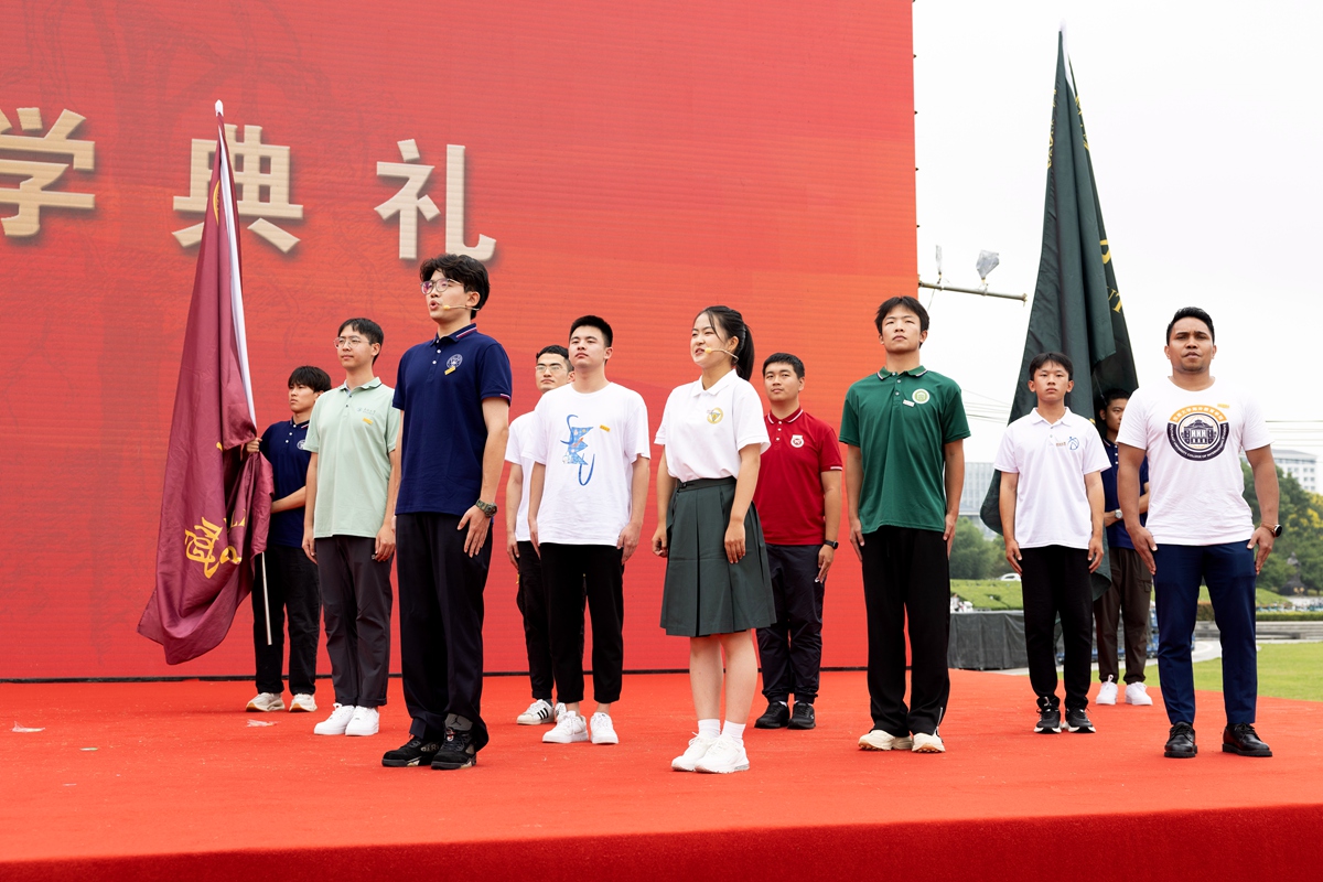东南大学国旗护卫队迈着铿锵的步履护送国旗入场。全体师生起立并齐唱国歌,五星红旗冉冉升起。在庄严的国歌声中,开学典礼正式开始。