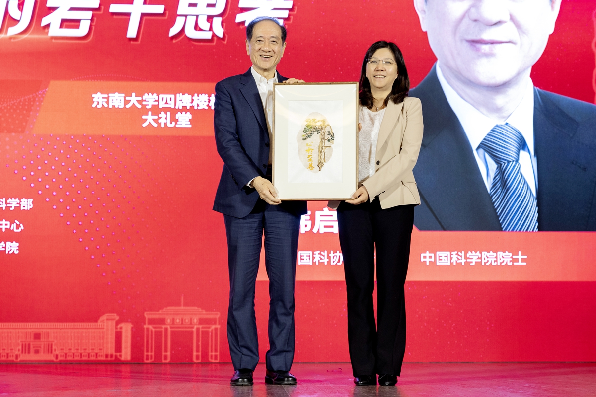 讲座结束后,黄如向韩启德赠送了南华彝绣《六朝松》,表达师生们的崇高敬意。