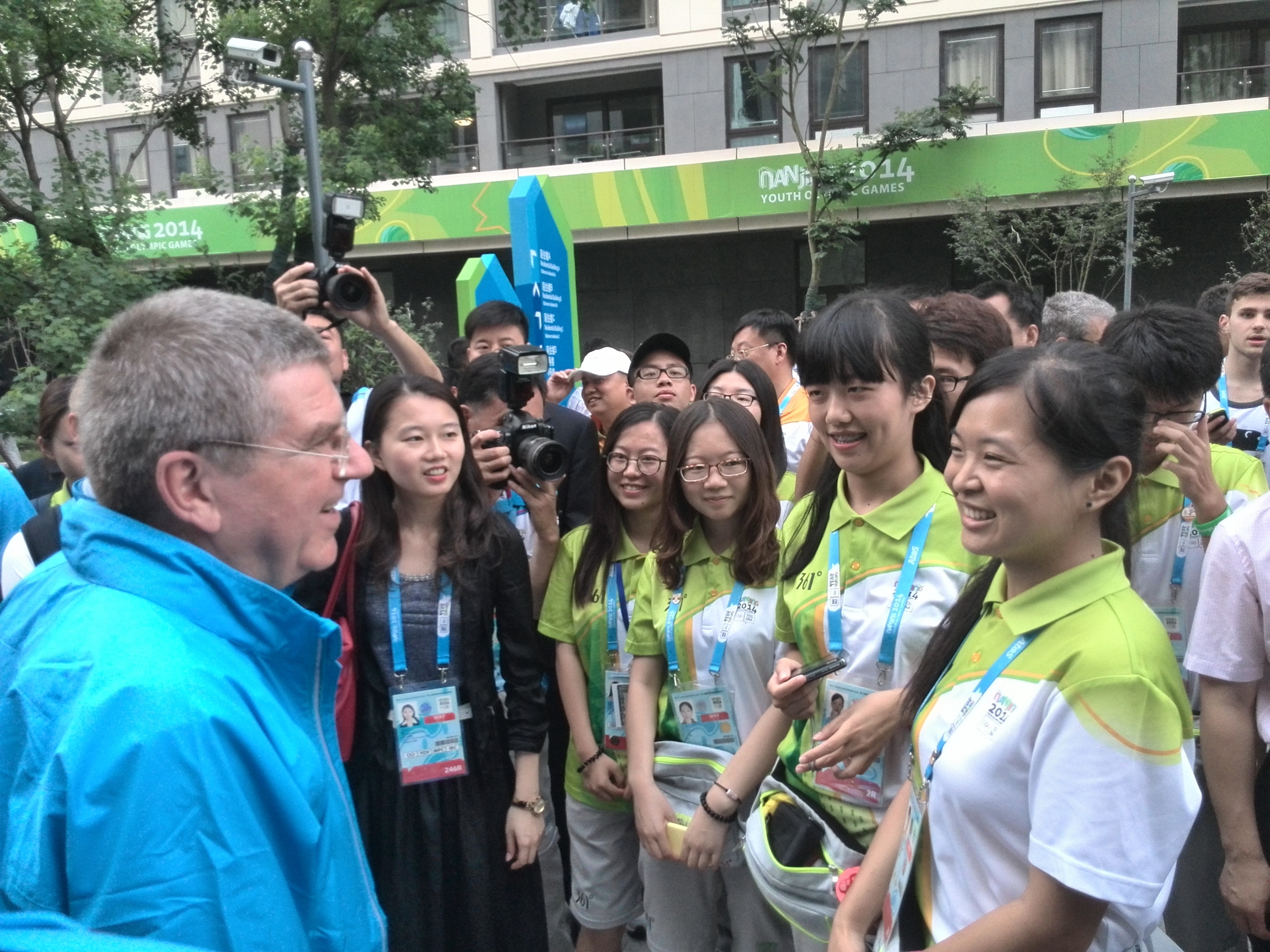 The President of the International Olympic Committee Thomas Bach (L1) greeted athletes and volunteers on August 15th, and gave them some International Olympic Committee Badges as presents.