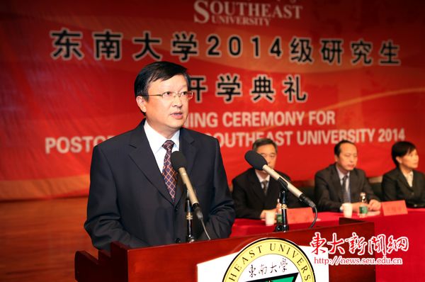 On the afternoon of September 4th, the Opening Ceremony for 2014 Postgraduates of Southeast University was held in Jiaotingbiao Theatre of Jiulonghu Campus. More than 4000 newly enrolled postgraduate students and a number of teachers attended the opening ceremony, including school leaders like Guo Guangyin, Yi Hong, Liu Jingnan, Lin Pinghua, Liu Bo, Zheng Jiamao, Shen Jiong, Wang Baoping, Ding Hui, Liu Hongjian; leaders of offices and departments. The degree awarding ceremony was hosted by Shen Jiong, our Vice President and Dean of the Graduate School.