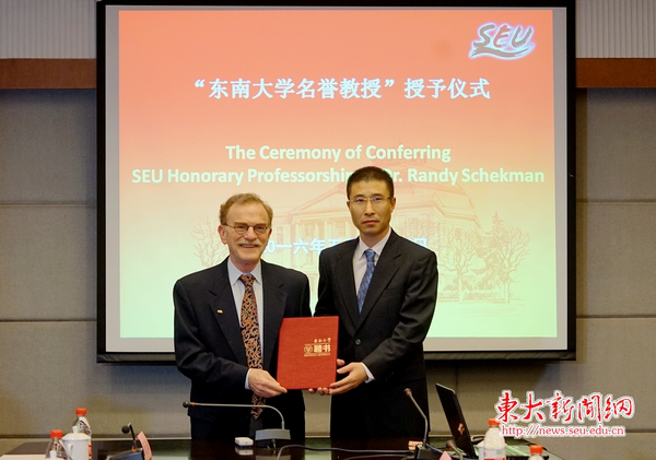 On May 24, SEU held a ceremony in Sipailou campus to confer Dr. Randy Schekman, the winner of Nobel Prize for physiology or medicine, American cell biologist at the University of California, Berkeley, as Honorary Professor of SEU. President Zhang Guangjun of SEU attended the ceremony and awarded an honorary professor letter to Professor Randy Schekman. Theceremony was hosted by Wu Gang, vice president of SEU, related personnel and student representatives attended the ceremony.