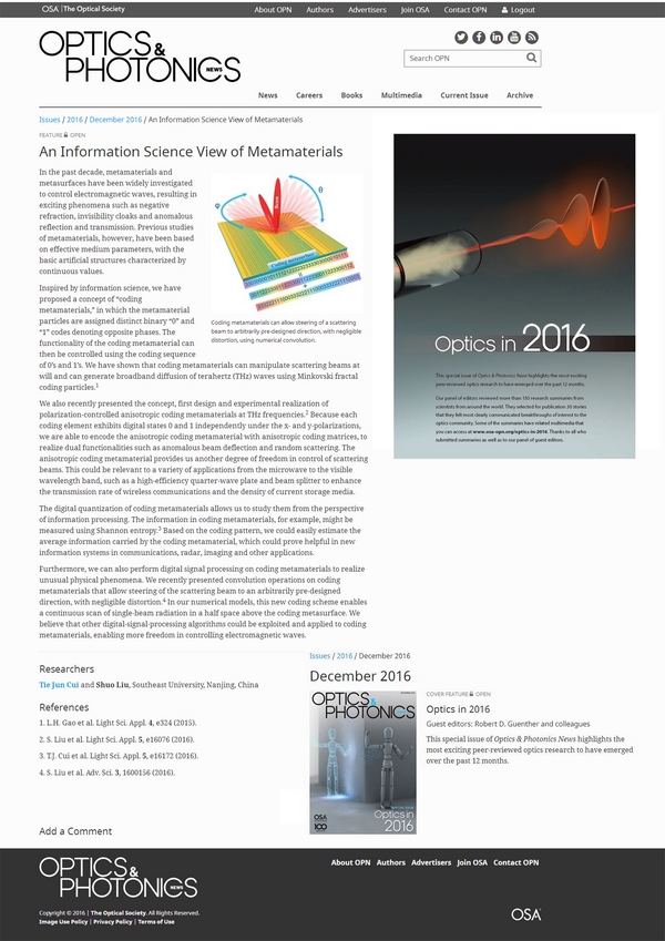Recently, the research work of an information science view of metamaterials, conducted by a research group which was led by Professor Tie Jun, Cui from the National Key Laboratory of Millimeter Waves of the School of Information Science and Technology, SEU, was selected by Optics and Photonics News -- the membership magazine of the Optic Society -- as one of the thirty most important work in optics, 2016. The article, titled “An Information Science View of Metamaterials”, reported three high-quality papers of the research group published in Light: Science and Application. Every year, Optics and Photonics News selects thirty of the most notable work in optics and photonic science.