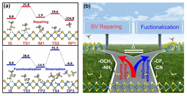 Professor Wang Jinlan and her team from Department of Physics, Southeast University published their latest research results in the field of two-dimensional materials on Angewandte Chemie International Edition (IF:11.99) with the paper named “Towards a Comprehensive Understanding of the Reaction Mechanisms Between Defective MoS2 and Thiol Molecules”.