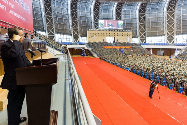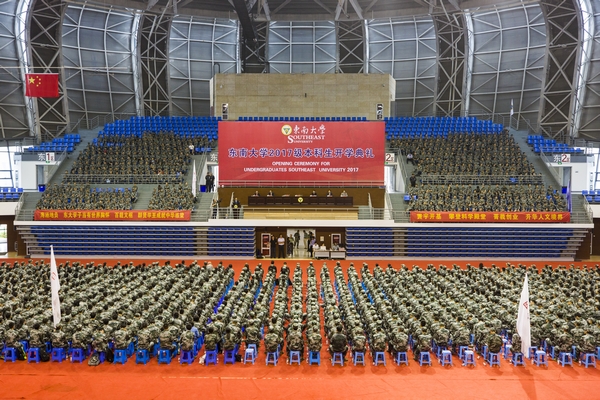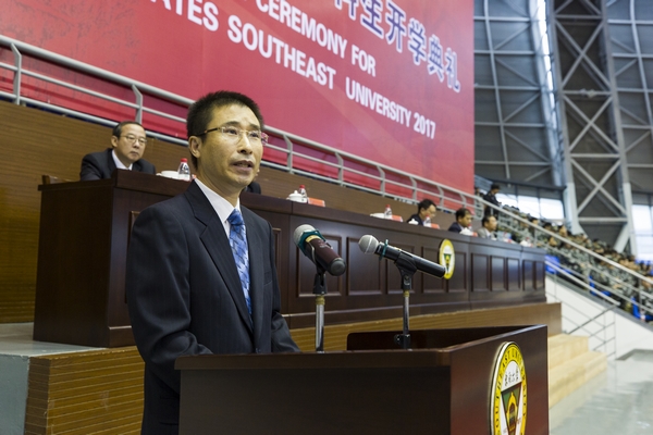 On September 4, Opening Ceremony for Undergraduates Southeast University 2017 was held in the stadium of Jiu Long Hu campus. President of SEU Zhang Guangjun, executive deputy secretary of the Party committee Zuo Wei, deputy secretary Zheng Jiamao, chief accountant Ding Hui, vice president Huang Dawei, Jin Baosheng, assistant to the president, dean of the School of Medicine, Liu Naifeng, directors of different departments, 3968 new undergraduates from across the country and 26 overseas students attended the opening ceremony. The ceremony was hosted by deputy secretary Zheng Jiamao. Before the ceremony, teachers and students watched a video of SEU produced by the Publicity Department of the Party committee.