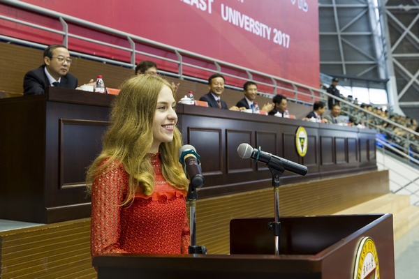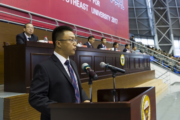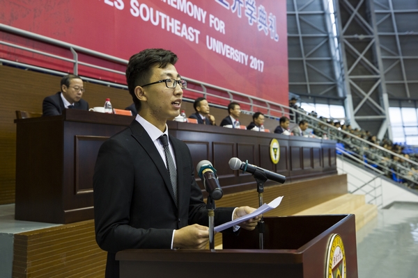 Afterwards, President Zhang expressed his three hopes towards students. The first one is to be aspiring. He hoped that students could establish great ambition, undertake the task of national rejuvenation, and become a patriotic leading talent with international view. The second is to make achievements. Students should improve their innovation spirit, innovation ability, and cooperation awareness. The third one is to become a person of integrity. He hoped that students could face the difficulties, learn from those better than themselves, and take the responsibility for the whole world. They should be righteous, serene, resolute, and strive for perfection. At last, President Zhang hoped that students would display the confidence of being a member of SEU, and shine with our era in the future.