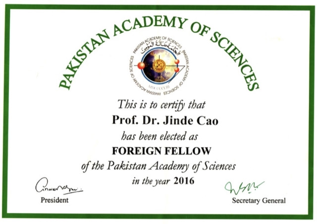Recently, Professor Jinde CAO from School of Mathematics, Southeast University had been elected as a foreign fellow of the Pakistan Academy of Sciences (PAS) for his original contribution to science. The decision was taken by PAS General Body in its meeting held on November 1, 2017 by ratifying the recommendations of PAS Council.