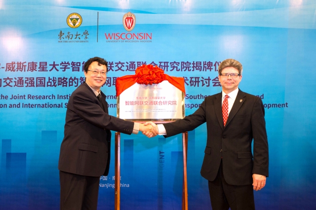At the opening ceremony, Zuo Wei, the deputy secretary of standing committee, expressed his welcome and thanks to all guests and representatives. He says that intelligent network transportation is an important opportunity in the transportation field. The related disciplines such as transportation, mechanics, civil engineering, electronics, computer science, automation are preponderant disciplines in Southeast University and the University of Wisconsin. The establishment of the joint research institute will promote the cooperation, multidisciplinary integration, andbuild a world-class intelligent networktransportation discipline group. The international seminar has an important practical and strategic significance for promoting the development of the transportation industry. Vice president Wu Gang read the approval of establishing The Joint Research Institute on Internet of Mobility between Southeast University and University of Wisconsin, and announced the head and academic committee members. Subsequently, Zuo Wei and Jeff Russell jointly inaugurated the institute.