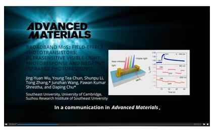 Recently, the team leading by Prof. Zhang Tong of School of Electronic Science and Engineering of Southeast University has made a significant progress on two-dimensional material photoelectric detector. On January 8 the research results were published in the top journal of materials research Advanced Materials. The article is titled “Broadband MoS2 Field-Effect Phototransistors:Ultrasensitive Visible-Light Photoresponse and NegativeInfrared Photoresponse”. On January 31 due to the recommendation of editor a video abstract of the article was released on official website of Advanced Materials, and other video website such as YouTube.