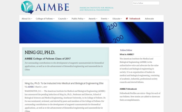 Recently, Prof. Gu Ning of School of Biological Science and Medical Engineering, Southeast University was appointed as AIMBE Fellow for his outstanding contribution to the development of magnetic nanomaterials for biomedical applications, as well as to the advancement of biomedical engineering and nanomedicine in China. On April 9th, 2018, AIMBE held the 27th annual conference at US National Academy of Sciences in Washington, and held the appointment ceremony at the conference for 5 Chinese scholars including Prof. Gu Ning.