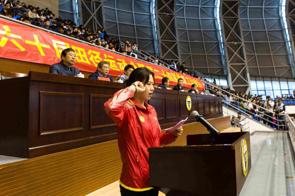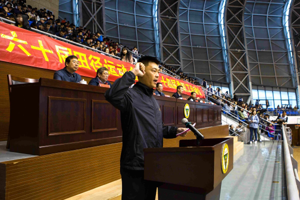 Afterwards the athlete representative Li Ningjie and the judge representative Ding Liang took an oath on stage; after the oath, Zuo Wei, Secretary of School CPC Party Committee declared the formal opening of the 60th Athletic Sports Meeting and the 24thFaculty Sports Meeting.