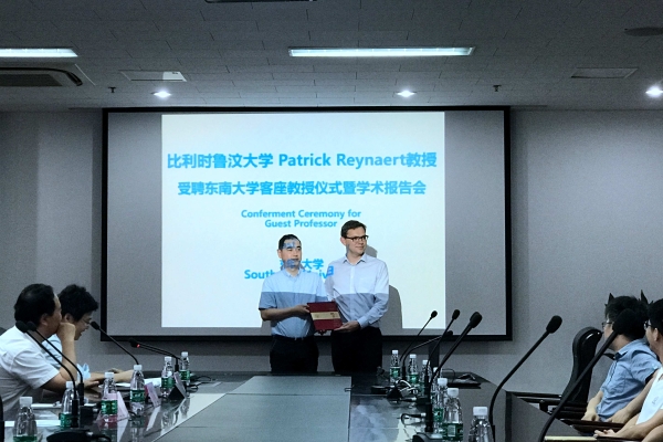 Professor You Xiaohu, Director of the State Key Laboratory of Mobile Communication of Southeast University, Professor Huang Yongming, Associate Dean of the School of Information Science and Engineering of Southeast University, and representatives of teachers and students of the School of Information Science and Engineering of Southeast University also attended the ceremony. In his speech, Associate Dean Huang Yongming firstly introduced Professor Patrick Reynaert's main experiences and achievements, highly appraised the scientific research achievements made by Professor Patrick Reynaert and expected Professor Patrick Reynaert to provide previous scientific research experience and innovative academic thoughts to the discipline construction of information science and engineering, RF microelectronics integrated circuits, etc.. Professor Patrick Reynaert’s main research directions include high-frequency, wideband, high-performance CMOS and SOI circuit power amplifiers, millimetre wave and terahertz integrated circuits as well as flexible fibre-based data communication circuits. Professor Patrick Reynaert has been serving as a professor of the Microelectronics and Sensors Research Team of Katolicki Uniwersytet Lubelski (KUL) since 2007, a TPC member, deputy editor and guest editor for several important conferences and journals in respect of integrated circuits: ISSCC, RFIC, ESSCIRC, TCAS-II and JSSC, etc. Besides, he is also working as Chairman of the Mixed Signal and RF Working Team of Global Semiconductor Alliance. His papers once won ESSCIRC Best Paper Award, TSMC European Practice Innovation Award and 2014 Bell Lab Award, etc.. Professor Patrick Reynaert said that he felt rather honoured to be appointed as a visiting professor of Southeast University and would continue to promote academic exchanges and cooperation between Southeast University and Katolicki Uniwersytet Lubelski (KUL) in Belgium so as to jointly cultivate high-level talents and carry out research work.