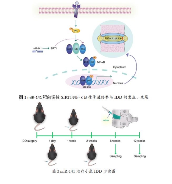 The research team first adopted microRNA chip technology and quantitative PCR technology to determine that the pathogenic factor is miR-141. Then miR-141 KO mice were observed about their natural history of intervertebral disc degeneration. The result indicatedthat silencing miR-141 can prevent intervertebral disc degeneration (IDD). Upon further research in vitro, the research team found that miR-141 can significantly affect the phenotype of nucleus pulposus cells. The gene expression profiling and bioinformatics studies found that miR-141 target can effectively regulate the expression of SIRT1 protein (Fig. 1), which would in turn inhibit the degeneration of intervertebral discs. What was important lied in the fact that the injection of nanoparticle-coated miR-141 into the mice’s intervertebral disc can significantly inhibit the degeneration of intervertebral disc (Fig. 2). This study took the initiative in elucidating the role of miR-141/SIRT1/NF-κB signal regulation axis in IDD, thus providing new ideas for the prevention and treatment of IDD. The work has been funded by the Natural Science Foundation of China and the Natural Science Foundation of Jiangsu Province.