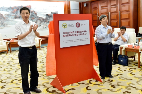 The signing ceremony was presided over by Zhang Ping, Secretary-General of Guizhou Provincial Government. Zhang Guangjun, President of Southeast University and Lu Yongzheng, Vice Governor of Guizhou Province, signed the agreement on behalf of both parties. Chen Yiqin, Vice Secretary of Guizhou Provincial CPC Committee and Governor of Guizhou Province, Zhu Xinwu, Party Secretary of Guizhou Provincial Education Department, Zou Keding, Director of Education Department, Zuo Wei, CPC Secretary of Southeast University and Wang Baoping, Managing Vice President of Southeast University attended the signing ceremony and witnessed the signing. Afterwards President Zhang Guangjun and Song Bao’an, President of Guizhou University jointly unveiled the Key Laboratory under the Ministry of Education about Urban and Architectural Heritage Protection of Southeast University (Guizhou Center).