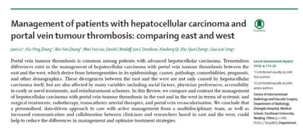 On August 6, the paper titled “Management of patients with hepatocellular carcinoma and portal vein tumor thrombosis: comparing east and west” composed by several top experts from China and U. S. together in the field of liver cancer was published in “The Lancet Gastroenterology & Hepatopathy” in the form of cover paper. Among others, Prof. Teng Gaojun, Director of Zhongda Hospital Affiliated to Southeast University and Prof. Cheng Shuqun from Shanghai Eastern Hepatobiliary Surgery Hospital are the correspondent authors.