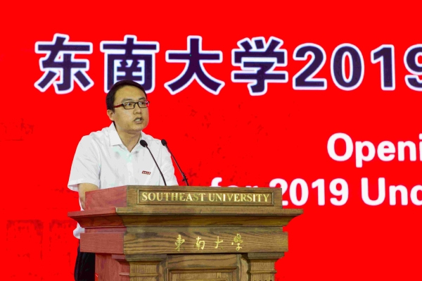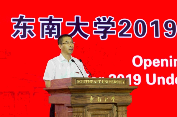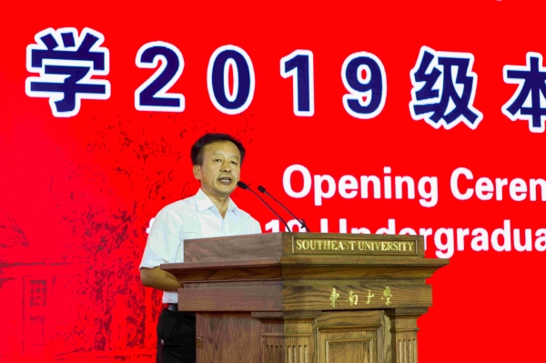 At the ceremony, Zhang Guangjun delivered a speech titled “keeping in mind the original aspiration and the mission, take the courage to become the leading talents”. On behalf of the school, he expressed his congratulations and welcome to the 3,982 undergraduate freshmen. Upon the historical moment of striving for the “two-centennial” goal and the 70th anniversary of the founding of New China, the students are not only the outstanding performers in the new era, but also the first batch of elites enrolled and to be cultivated by Southeast University in a large category. He pointed out that Southeast University as chosen by the students is a sacred place for study highlighting a long history and profound knowledge in pursuit of excellence. Generations of Southeast University people have been adhering to the philosophy of “striving for perfection”, and have thus created the initial aspiration and mission of “getting renowned with science and contributing the country with talents.” The current Southeast University is shouldering the new mission of flourishing the country with education, science and technology, composing a new chapter of constructing the first-class university and striving for perfection, and establishing the “1-10-100” vision of Southeast University’s Dream. Zhang Guangjun emphasized that the new era faced by contemporary youth would not only be the best era for the development of the Chinese nation in modern times, but also a key era for realizing the great rejuvenation of the Chinese nation. In the face of a more sacred and arduous mission of the times, students have to contemplate: what kind of person do you want to be? what is your value pursuit? how could you embrace the new era and strivein the new era? Zhang Guangjun pointed out that the school would be committed to cultivating students and ultimately expect students to become the leading talents highlighting patriotism and international view, who can lead the future and benefit mankind. Besides, President Zhang shared the four connotations of leading talents: first of all, it is prerequisite to cultivate the patriotism. The students are expected to inherit the Chinese cultural genes, establish the lofty aspirations, nourish the patriotism with the spirit of “striving for perfection”, integrate the realization of personal dreams and family dreams into the national dreams. Moreover, the students should take root in the people, contribute to the country, always get integrated with the destiny of the country and the times. Secondly, the international view shall be shared and expanded. The students shall be confident and open-minded, have the concept and thinking of openness and sharing, carry forward the spirit of Chinese cultures of “all people belonging to one family” and “the whole world as one community”, and strive to improve their global competence at a higher position and with further vision so as to accumulate energy for accessing the center of the global stage. Thirdly, the students should lead the future with innovation. They are expected to inherit Southeast University's courage and wisdom of “getting renowned with science”, practice the ability of independent innovation diligently. In this case, the students could advance, become stronger, win and lead the future with innovation. Fourthly, the students should strive for the benefit of mankind. They are expected to make unremitting efforts and conscious actions, and strive to contribute more Chinese wisdom, Chinese programs and Chinese power to the world, create value and achieve a greater self in the course of contributing to the times and benefiting the mankind.
