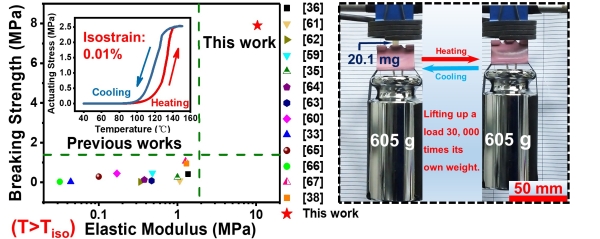 LCE is a typical two-way shape memory material, which is characterized by such technical advantages as large deformation and reversible deformation, etc.. It has a good application prospect in the fields of bionic devices and soft robots. However, upon the long development of 40 years, the research on LCE still remained in the laboratory and has not yet been industrialized. The key scientific problem limiting its application lies in the fact that the stress generated by the liquid crystal elastomer during deformation is too small to meet the mechanical performance requirements of the actual application scenario. Prof. Yang Hong’s research team studied from a different approach by preparing a kind of LCE material of polyurethane/polyacrylate interpenetrating network structure through mixing and then resynchronizing the cross-linking of small molecular precursor components of polyurethane LCE and polyacrylate liquid crystalline thermosets. In this way, this LCE material features the shrinkage strain, the stress and the elastic modulus of 46%, 2.53 MPa and 10.4 MPa respectively, which can fully meet the mechanical properties of LCE-based artificial muscle for the first time.