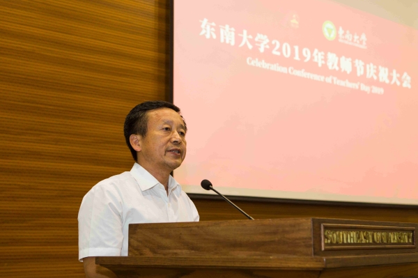 President and Academician Zhang Guangjun, delivered a speech at the conference titled “Establish the Morality and Cast the Teacher’s Spirit to Cultivate Talents for the Country”. He firstly extended his festival greetings and heartfelt blessings to the faculty and employees, the retired teachers, the former leaders and the veteran comrades on behalf of the school. He reviewed the new achievements as made in the course of the school’s reform and development regarding the talent training, the construction of teachers’ team, the scientific researches, the discipline construction, the international cooperation, the construction of a “Beautiful Southeast University” and the cooperation between the school and local places in the previous year under the efforts of all teachers. He further emphasized that all these progress, gains and achievements cannot be made without the wisdom and sweat of all teachers.