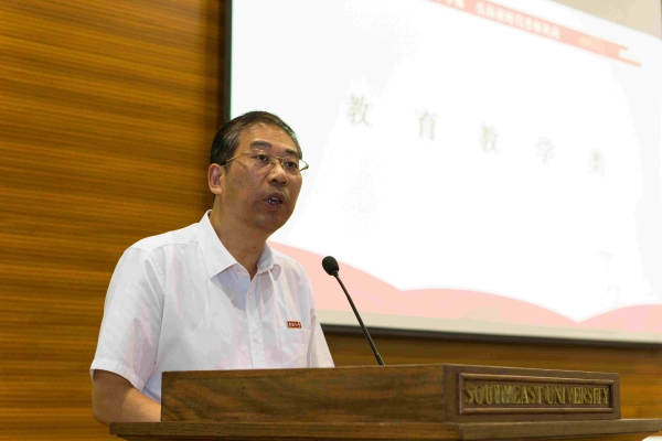 Zhang Guangjun emphasized that the teachers should be deemed as the foundation of education and the source of flourishing education. The current mission of building a socialist modernization power with Chinese characteristics has put forward new and higher requirements on the construction of the teaching staff. He quoted General Secretary Xi Jinping’s speech at the National Education Conference and the Teachers’ Symposium about the ideology and politics theory classes in school to encourage all the teachers and put forward three expectations. Firstly, all the teachers should strengthen the ideals and beliefs, and establish a higher scope of vision. It is hoped that all the teachers could adhere to the socialist school-running direction, inherit Southeast University’s great ambition of “serving the country with talents”, and keep in mind the aspiration of cultivating talents for the nation so as to upgrade their profession of education to a lofty cause for the national rejuvenation. Secondly, all the teachers should carry forward the noble teacher’s ethics to became the “Mr. Master”. It is hoped that all the teachers could take the lead in promoting socialist morality and traditional Chinese virtues, influence and motivate students with their exemplary behaviors, make unremitting efforts to pursue perfection and strive to become the “Mr. Master” respected by students sincerely. Thirdly, all the teachers should persist in innovation to achieve great academic accomplishments. It is hoped that all the teachers could adhere to the school’s spirit of “becoming renowned with science, dare to seek innovation in study, seize thecommanding height of technological competition and future development, and indeed pass on the “golden key” to the students to open the scientific palace.