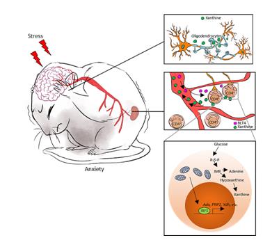 The mitochondria can provide energy for the life activities of cells, and the changes in their mitochondrial morphology are involved in the regulation of cellular metabolism, which is essential for the normal development and maintenance of cells. Miga2 is a mitochondrial outer membrane protein. Knocking out Miga2 can result in severe damage to the mitochondrial raft structure, and therefore, the mitochondria may lose its normal tubular or reticular morphology but form a fragmented morphology. In the electrophysiological audiology test, Prof. Chai Renjie’s team found that after specifically knocking out MIGA2 in the mice’s T cells, the mice showed hearing impairment, and the auditory brainstem-evoked reaction (ABR) as stimulated by ambient sounds of various frequency is lower than that of normal mice. In order to further understand how the mitochondrial morphology in immune cells affects the animal’s physiological reaction, Prof. Chai Renjie’s team worked with Prof. Jin Jin’s team from Zhejiang University. They adopted various animal behavioral experiments as the evaluation criteria. It was found that the mice lacking CD4+ T cells in the body can avoid the chronic stress-induced mental illness under external pressure. The experimental data showed that under chronic stress, the content of leukotriene b4 in mice increased; as a result, a large number of non-inflammatory CD4+ T cell mitochondria including Naive T cells were fragmented. The corresponding metabolomics and transcriptome analysis indicated that the mitochondrial fragmentation in CD4+ T cells may lead to the accumulation of the transcription factor IRF1. The combination of IRF1 with Ada, Xdh and Pnp2 promoter regions enables more glucose to be metabolized through the pentose-phosphate pathway, promoting purine synthesis from scratch. In the chronic stress anxiety model, the serum xanthine in mice increased significantly. The clinical evidences collected by Prof. Chai Renjie’s team from Nanjing Gulou Hospital also showed that the patients with anxiety disorders had elevated serum xanthine when compared with the healthy controls. The brain amygdala plays a key role in the production of fear and anxiety. Excessive purine produced by T cells (including hypoxanthine and xanthine) enters the brain through the blood circulation, and combines with adenosine receptor A1 on the oligodendrocytes in the amygdala on the left side of the brain. Such combination then causes the oligodendrocyte activation and proliferation. The over-activation of neurons in the left amygdaloid nucleus area leads to anxiety symptoms. At the same time, an adeno-associated virus is injected into the left amygdala of the mice by using a brain localization injection device to specifically knock out the receptor A1 in oligodendrocytes. As a result, the symptoms of anxiety mice were significantly improved after A1 has been knocked out, which further verified the above conclusion.