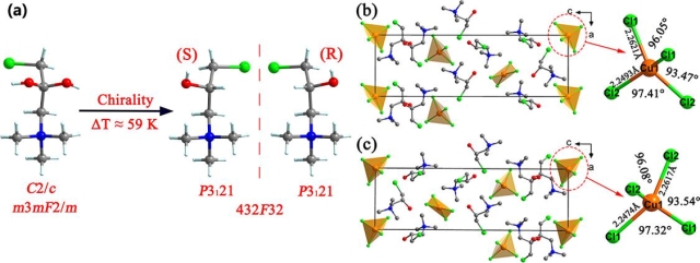As early as in1999, Wataru Fujita et al. reported the magnetic bi-stable state in Science (Science1999, 286, 261–262) and observedan obvious magnetic bi-stable loop in the temperature range of 230K to 305K in the 1,3,5-trithia-2,4,6-triazapentalenyl (TTTA) molecules. Its high-temperature phase was represented as a paramagnetic phase and its low-temperature phase featured diamagnetism under the influence of dimerization. Three years later, ME Itkis et al. reported in Science that the bi-stable characteristic of electrical, optical and magnetic physical channels was found in the neutral free radical product of phenalenyl (Science2002, 296, 1443–1445 ). Until 2014, Prof. Xiong Ren’gen’s team reported in Advanced Materials that the imitable periodate (IPI) compound highlighted the bi-stable characteristic in respect of five physical channels including dielectric, piezoelectric, SHG, ferroelectric and electromechanical channels (Adv. Mater. 2014, 26, 4515–4520). It can be seen that each additional physical channel faces huge challenges. Under the guidance of the “ball-like” principle of molecular ferroelectric and the introduction of chirality, we used chiral ligands for synthesis and introduced chiral switches therein, finally achieved (R-CTA)2CuCl4 and (S-CTA)2CuCl4 (CTA =3-Chloro-2-hydroxypropyltrimethylammonium) (Fig. 1). These two compounds highlight the switching characteristics in respect of seven physical channels including dielectric, electrical conductivity, second-order nonlinearity, piezoelectricity, ferroelasticity, chirality and thermochromism. Among others, the thermochromic feature is particularly special, making it distinctive from that of traditional phase change materials. This has provided a new inspiration of spectral encryption for bi-stable switches.