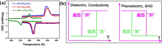 The phase-transition points of (Rac-CTA)2CuCl4, (R-CTA)2CuCl4 and (S-CTA)2CuCl4 appear near 361K, 417K and 420K respectively (Fig. 2). With the temperature changes, the dielectric constant, electrical conductivity, piezoelectric coefficient and SHG signal strength of the low-temperature phase below the phase-transition temperature and the high-temperature phase above the phase-transition temperature all indicate two switchable stable states.