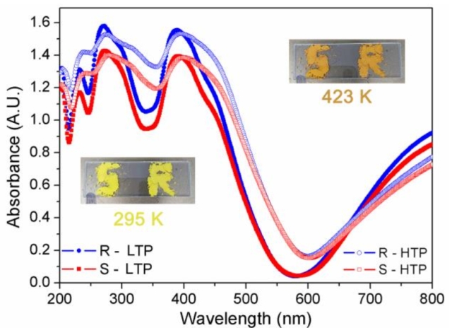 In addition to ferroelasticity, this chiral crystal also exhibits switchable thermochromic property. At room temperature, (R-CTA)2CuCl4 and (S-CTA)2CuCl4 crystals absorb lights below 540 nm, which is consistent with their yellow appearance. When the temperature increases, the absorption edge of the electron absorption band redshifts. When the temperature exceeds the phase-transition point and reaches 423K, the absorption edge moves to 580nm, which is also consistent with the crystal’s change to orange when heated. The adoption of this thermochromic property for specific processing of spectral encryption and signal detection has provided a new insight for developing new encryption technologies.