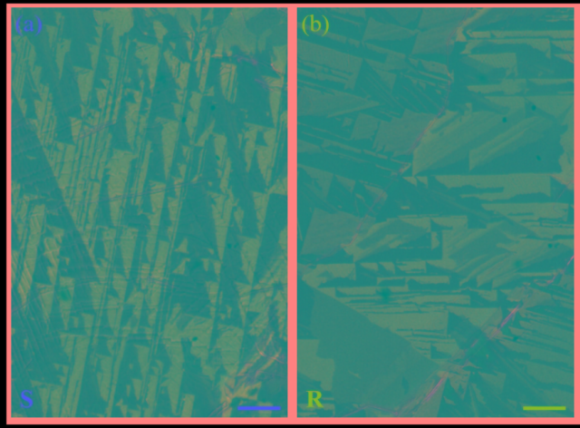 In addition, this chiral compound also features ferroelasticity. The ferroelastic phase transition is often accompanied by the evolution of ferroelastic domains. Under orthogonally polarized lights, the ferroelastic domains with different orientations indicate different birefringence characteristics, thereby showing the structural regions highlighting different shades. The crystalline films of (S-CTA)2CuCl4 and (R-CTA)2CuCl4 showed a clear triangular ferroelastic structure at room temperature. When the temperature is higher than the phase-transition point, the ferroelastic domains disappear quickly, showing extinction with cubic symmetry. In the subsequent cooling, the regular ferroelastic domains appear again quickly, showing obvious switching characteristic.