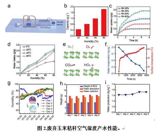 With the development of human society and rapid population growth, the energy crisis and the shortage of drinking water have become common challenges confronted by mankind. The atmosphere contains a large amount of water vapor at all times (~ 1021 liters of water equivalent). If such water vapor can be recycled from the air to produce pure water, it is expected to solve the shortage of drinking water in water-deficient areas. In view of this, the clean energy team started from waste biomass materials innovatively by using the inherent characteristics of abundant pores and large specific surface area in waste straws, thusdeveloped a kind of high-performance material that can generate water from air effectively in a full-humidity environment. In the range of 20% -80% wide humidity and 5-65 ℃ wide temperature, the waste straws can achieve a water generation rate of 0.5-2.0 kg.kg-1, which has verified the water-production performance of biomass straws in different external environments (ranging from cold zone to tropical zone, from desert to tropical rainforest, etc.). Besides, the ingenious design of the condensing device has achieved high-efficiency all-weather water generation by water absorption at night and water generation at daytime (as shown in Fig. 2).