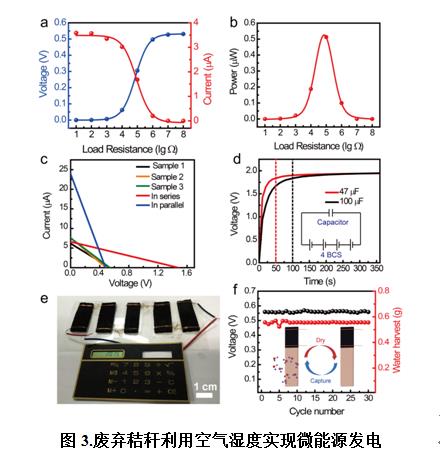 In addition, the clean energy team used cheap commercial inks ingeniously to control the surface properties of the waste straws, thereby generating electricity up to 600mV in a continuous manner while the waste straws were absorbing air humidity; besides, the team designed and prepared an integrated device for water purification and electricity generation. The electrical energy as generated by the device in the course of water purification can drive electronic calculators and other electronic equipment, which has verified the potential application of such device as a micro-energy generator, as shown in Fig. 3.