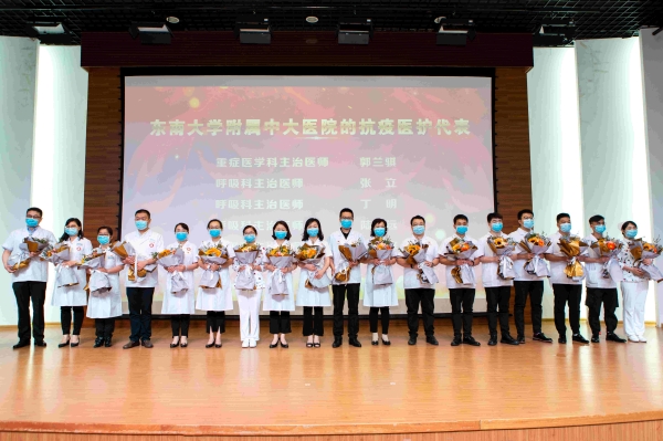 In this battle against the epidemic, SEU has dispatched 22 medical staff in 11 successive batches for assisting the epidemic-stricken cities, as represented by Qiu Haibo’s team from Zhongda Hospital Affiliated to SEU. They fought at the front line in Wuhan City, Huangshi City, Jiangsu Province, Heilongjiang Province and Jilin Province to make the due “SEU’s contribution” to the epidemic treatment. During the ceremony, student representatives presented fresh flowers to the anti-epidemic medical representatives of Zhongda Hospital.