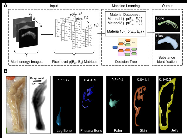 On this basis, the research team further established a “multi-energy material database” and an intelligent recognition process for practical applications. First, absorption information from different energy channels was used to normalize the linear attenuation coefficient of each pixel so as to construct “energy fingerprints” composed of several σ(Ei)/σ(Ej) ratios, thereby mitigating the influence of sample thickness and dose fluctuations. Subsequently, standard sample data for common materials such as metals, polymers, and biological tissues were collected, and their energy fingerprint distributions were statistically analyzed to form a visualized material database. During imaging, the system matches the energy fingerprint of unknown pixels against the material database one by one. By integrating distance metrics and machine learning classification algorithms, automatic pixel-by-pixel identification and pseudo-coloring are achieved. This achievement enables different materials to be distinctly displayed and easily distinguished in X-ray images, even under conditions of complex overlapping layers and varying thicknesses.