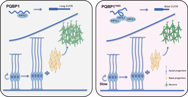 Renpenning syndrome is an X-linked genetic disorder, typically presenting with intellectual disabilities and microcephaly. This disease is mainly caused by mutations in the polyglutamine-binding protein 1 (PQBP1) gene. The Y65C missense mutation in this gene leads to the most severe clinical symptoms, though its pathogenic mechanism was previously unclear. The research team constructed a Pqbp1Y65C/Y-KI mouse model and revealed that this mutation affects brain development through dual pathways. On one hand, it causes a typical loss-of-function effect — the mutation leads to a decrease in PQBP1 protein levels, which in turn slows down the proliferation of neural progenitor cells. On the other hand, it also triggers a gain-of-function effect — the mutation enhances the binding of PQBP1 to the key regulatory factor Fip1l1, thereby disrupting the process of alternative polyadenylation (APA), affecting the maturation and stability of mRNA, and ultimately leading to abnormal neuronal differentiation. This study has not only clarified the pathogenic mechanism of the PQBP1-Y65C mutation in causing microcephaly but also provided a model for understanding the pathogenesis of genetic diseases, offering new strategies for potential treatments.