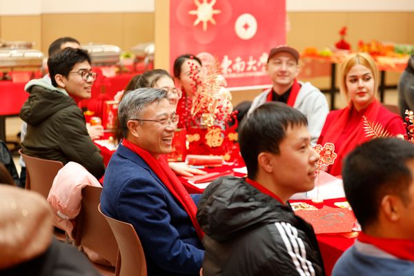 On the morning of February 15 (the 28th day of the 12th lunar month), Southeast University's Jiulonghu Campus was adorned with festive red lanterns along the roads, while "Fu" character paper-cuts and window decorations graced canteens and dormitory buildings, filling the campus with a strong New Year atmosphere. Wu Xiaocheng, Secretary of the CPC Southeast University Committee, and Xing Jihong, Deputy Secretary of the CPC Southeast University Committee, accompanied by administrators of the Party Office, General Affairs Office, Student Affairs Office, Graduate School, the College of International Students, and other relevant schools, visited and extended festive greetings to frontline on-campus staff on duty, met with students staying on campus during winter vacation, and had a New Year lunch together with them.