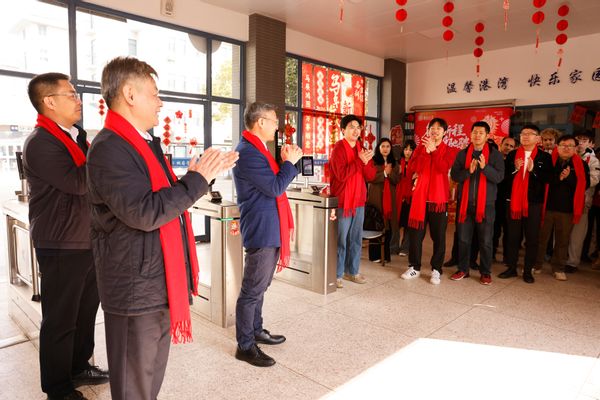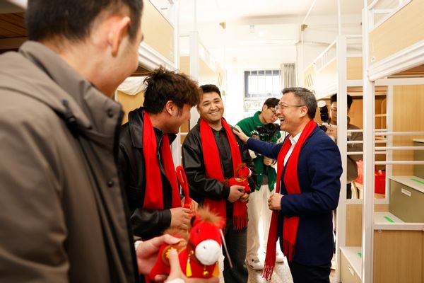 Subsequently, Wu Xiaocheng and the teachers presented carefully prepared New Year gift packs to the students, and together they pasted Spring Festival couplets and window decorations, hung Chinese knots, and displayed Year of the Horse mascots. During the event, Wu Xiaocheng had cordial conversations with the students, inquiring about their study plans, living conditions, and practical needs during the winter vacation, and posed for a group photo with them at the entrance of the Taoyuan Dormitory.