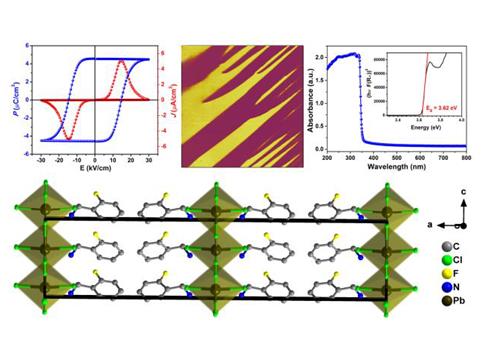 The similarities between fluorine and hydrogen atoms in structural parameters such as the Van der Waals radius serve for the maximum maintenance of the original packed structure and crystal symmetry. In the meantime, the strong polarity and larger molecular dipole moment brought by the introduction of maximum electronegativity fluorine atom can also contribute to more polarized unit cell. On that basis, our team adopted the modified strategy of “fluoro effect” to obtain Fluorobenzylamine cations, and then successfully designed and synthesized the 1st two-dimensional organic-inorganic perovskite ferroelectric semiconductorwith the fluorinated aromatic spacers [2-fluorobenzylammonium] 2PbCl4. Its phase-transition temperature reaches 448 K, with bothexceptional ferroelectric properties and semiconductor features. This work provides a reliable method for making two-dimensional organic-inorganic perovskite ferroelectric semiconductor system more diverse and improving the performance and stability of perovskite devices by using more complex conjugated aromatic cations, which wouldlead to more relevant research.