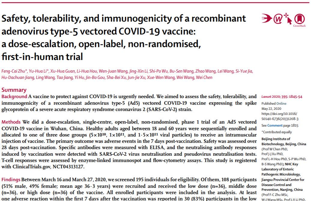 Related trials evaluated an adenovirus vector recombinant novel coronavirus vaccine. As introduced in the paper, more than 500 volunteers participated in the Phase 2 clinical trial in China, including people over 55 years old. The range of participants was even larger when compared with that in the Phase 1 clinical trial. The trail was to evaluate whether this vaccine could induce an immune response in the human body and whether it was sufficiently safe. The results showed that the vaccine had produced good results in both aspects.